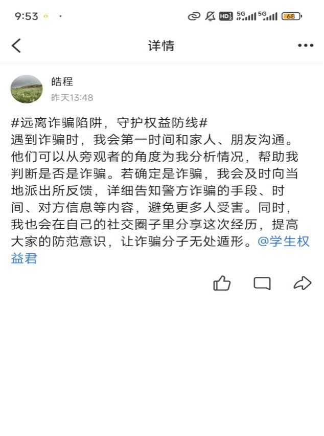 “远离诈骗陷阱,守护权益防线”不只是一句口号,更是一份责任和行动。此次线上打卡权益活动让同学们互相提醒,共同学习,营造了良好的防诈骗氛围,有力地遏制了校园电信网络诈骗的发生,为大学生权益筑牢防线。